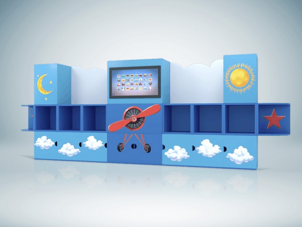 Продуманный до мелочей дизайн компактно вмещает в себя несколько игровых зон. На центральной части находится интерактивная панель со специализированным программным обеспечением. Удобные открытые книжные полки, скрытая от детского взгляда система хранения, соответствуют всем требованиям ФГОС.