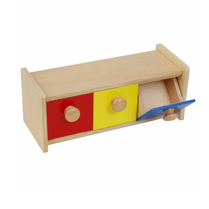 В первый раз покажите ребёнку как открыть и закрыть ящичек. Дайте ему возможность исследовать содержимое остальных ящичков самому.