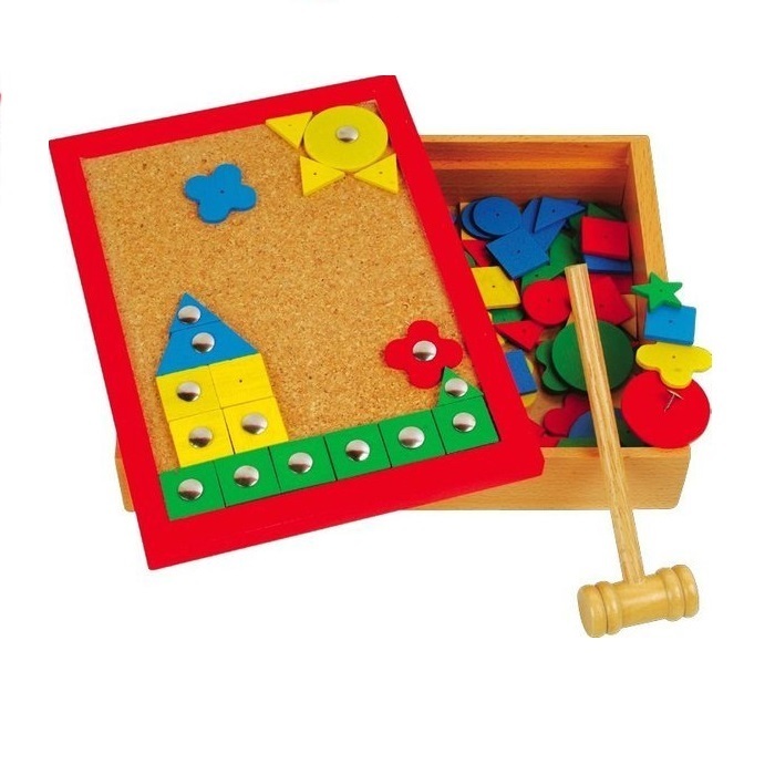 Игра представляет собой набор разноцветных деталей различной геометрической формы - квадратиков, треугольничков, кружочков и др. с отверстиями, гвоздиков, молоточка и игрового поля. Из деревянных деталей ребенок может собирать на поле различные комбинации, закрепляя их с помощью специальных гвоздиков и молоточка. При игре ребенок познакомится с геометрическими фигурами и основными цветами. Игра с такой мозаикой поможет развитию у ребенка фантазии, внимания, усидчивости, логического мышления, моторики пальчиков и творческих способностей.