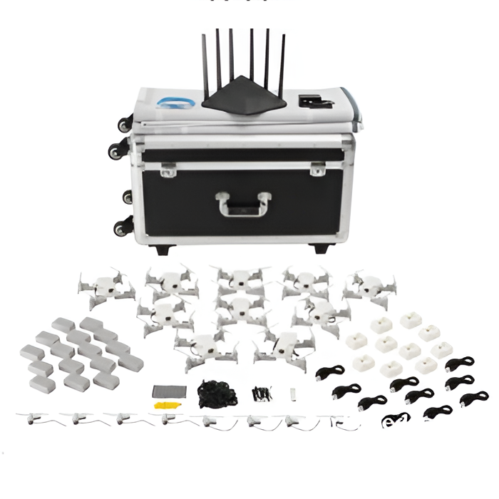 Набор БПЛА мультироторного типа представляет собой набор из 10 беспилотных летающих аппаратов с расширенной комплектацией. Набор БПЛА предназначен для демонстрации одновременного запуска квадрокоптеров и для отработки алгоритмов роевого интеллекта.